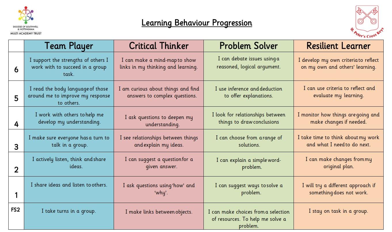 Throughout our time at school we develop and build on our understanding of how to embed these learning behaviours within all areas of school life. Below is our progression chart to show how we build on these behaviours each year.