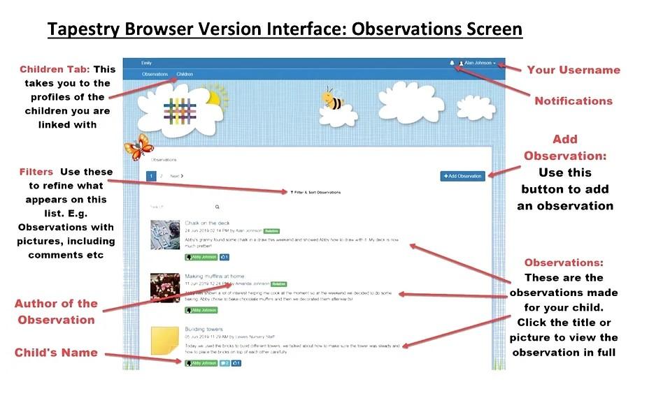 The system will automatically send you an email when an observation for your child has been added. Tapestry is used to document new learning and achievements.