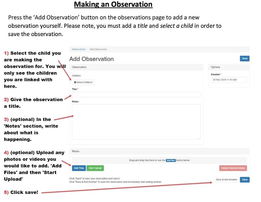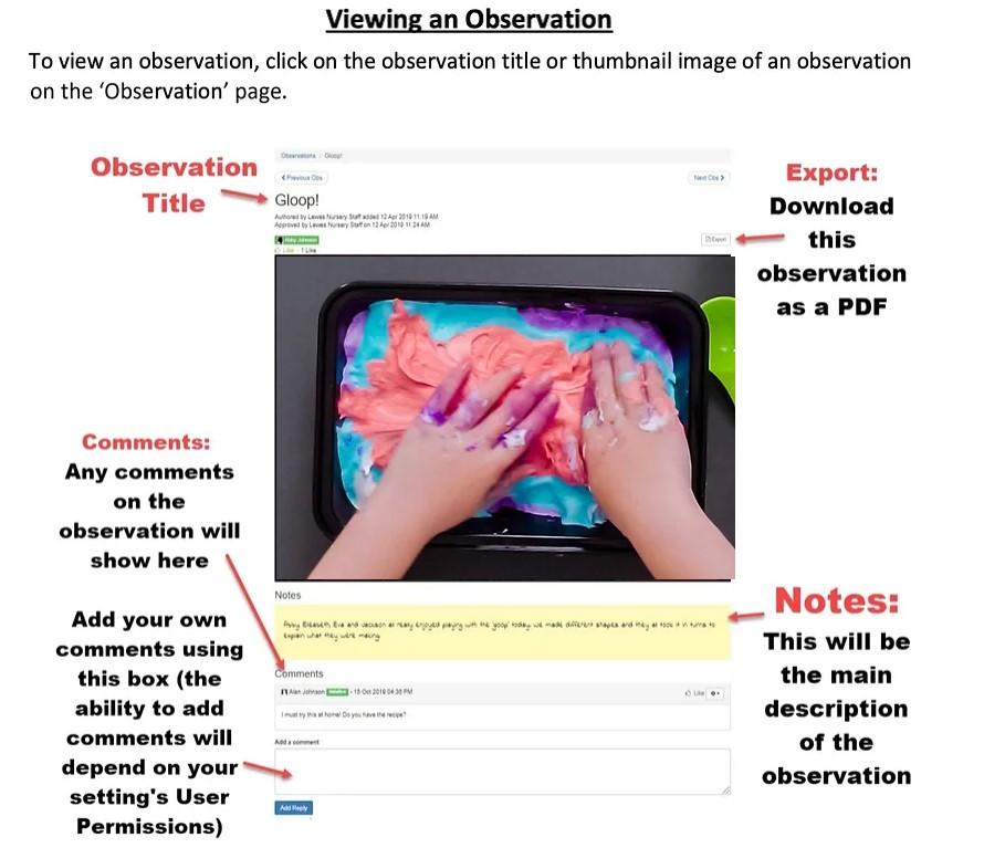 Once logged in, you will see your child’s observations on your home screen in a list – selecting any one of these will open up the observation for you to look at. You may add comments in the box at the bottom of the observation if you would like to - and we would love to receive such comments!